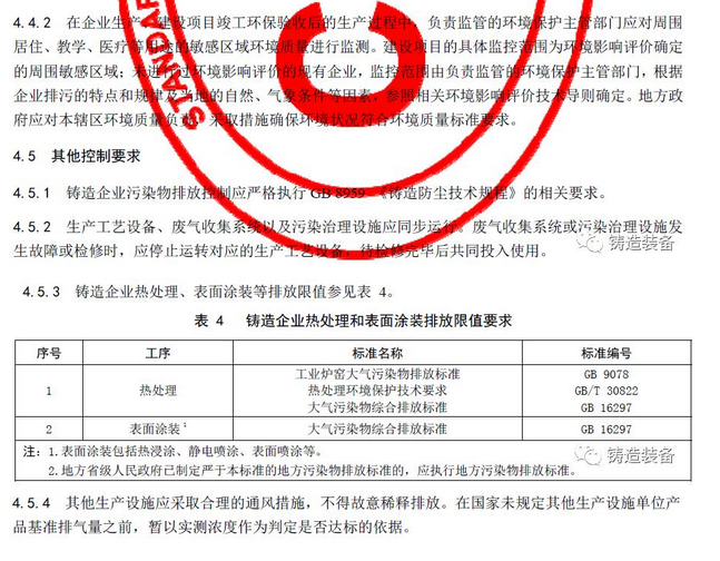 現(xiàn)摘錄T/CFA030802-2—2017中“4排放控制要求”、“5污染物監(jiān)測要求”、“6實(shí)施與監(jiān)督”部分。前三部分“1范圍、2規(guī)范性引用文件、3術(shù)語與定義”請自行登錄中國鑄造協(xié)會(huì)網(wǎng)站查閱。
