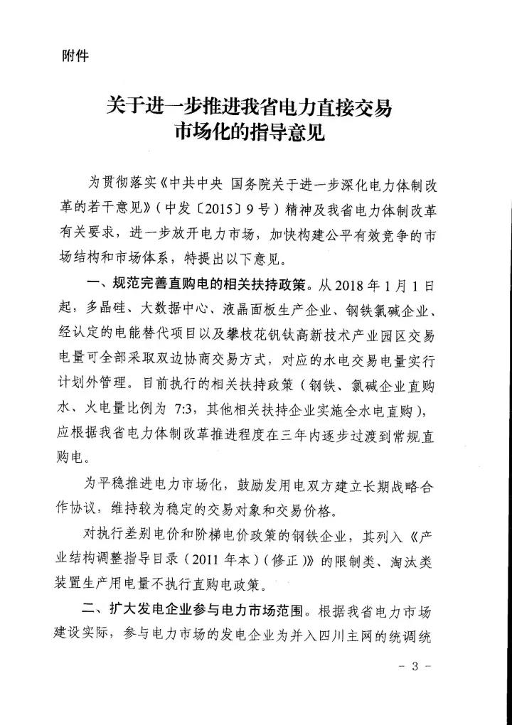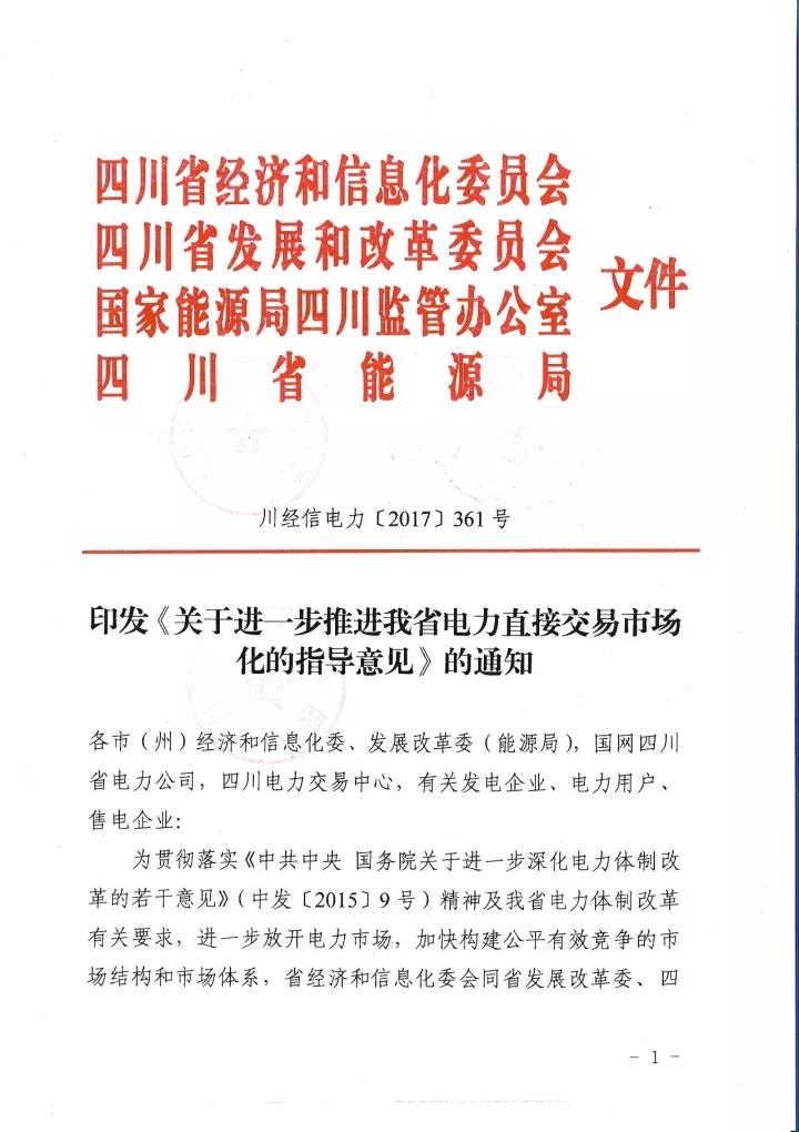 四川省經(jīng)信委、四川省發(fā) 改委、國(guó)家能源局四川監(jiān)管辦、四川省能源局日前聯(lián)合下發(fā)了《關(guān)于進(jìn)一步推進(jìn)我省電力直接交易市場(chǎng)化的指導(dǎo)意見(jiàn)》(以下簡(jiǎn)稱“意見(jiàn)”)。意見(jiàn)中稱,將規(guī)范完善直購(gòu)電的相關(guān)扶持政策,擴(kuò)大發(fā)電企業(yè)參與電力市場(chǎng)范圍,全面放開售電公司參與電力市場(chǎng),穩(wěn)步推進(jìn)進(jìn)商業(yè)用戶進(jìn)入電力市場(chǎng),積極開展產(chǎn)業(yè)園區(qū)直接交易試點(diǎn),穩(wěn)妥開展跨省跨區(qū)富余可再生能源電力現(xiàn)貨交易試點(diǎn),放開地方電網(wǎng)(躉售區(qū))進(jìn)入直接交易市場(chǎng),有序推進(jìn)其他特殊行業(yè)企業(yè)完全電力市場(chǎng)化。詳情如下: