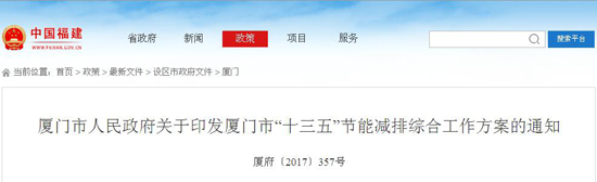 廈門市印發(fā):《廈門市“十三五”節(jié)能減排綜合工作方案》