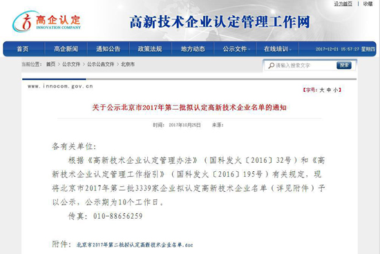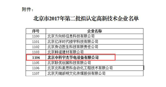 近日,國家高新技術(shù)企業(yè)認定管理工作網(wǎng)發(fā)布了《關(guān)于公示豐臺園2017年第二批擬認定高新技術(shù)企業(yè)名單的通知》,北京中科宇杰節(jié)電設(shè)備有限公司通過認證,榮獲“國家高新技術(shù)企業(yè)”的殊榮。
