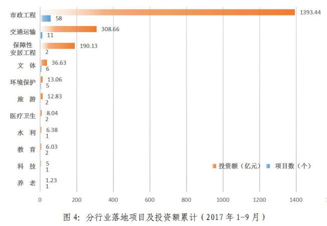 2017年1-9月,累計新落地項目數(shù)排名:市政工程(58個)、交通運(yùn)輸(11個)、文體(6個)、環(huán)境保護(hù)(5個)、保障性安居工程(2個)、醫(yī)療衛(wèi)生(2個)、教育(2個)、旅游(2個)、養(yǎng)老(1個)、水利(1個)、科技(1個)。