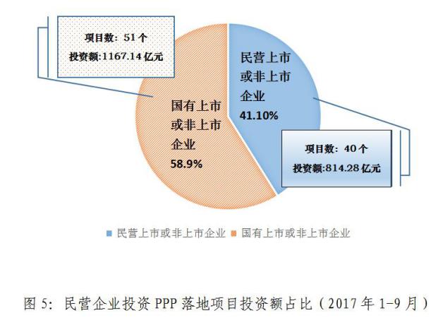 2017年9月,民營企業(yè)以聯(lián)合體牽頭方或者單獨(dú)作為社會資本方落地項目投資額206.95億元。2017年1-9月累計投資額814.28億元,占41.10%。