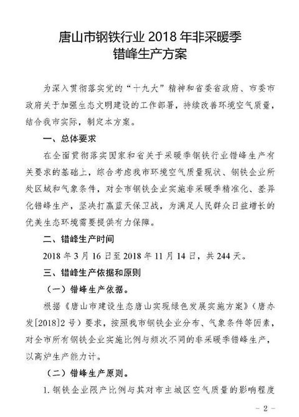 日前,《唐山市鋼鐵行業(yè)2018年非采暖季錯峰生產(chǎn)方案》經(jīng)市政府同意,已正式下發(fā)。方案中明確了錯峰生產(chǎn)依據(jù)和原則,綜合考慮唐山市環(huán)境空氣質(zhì)量現(xiàn)狀、鋼鐵企業(yè)所處區(qū)域和氣象條件,對全市鋼鐵企業(yè)實施非采暖季精準化、差異化錯峰生產(chǎn)。全文如下: