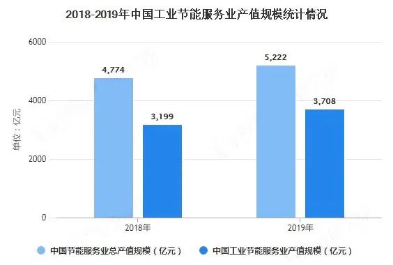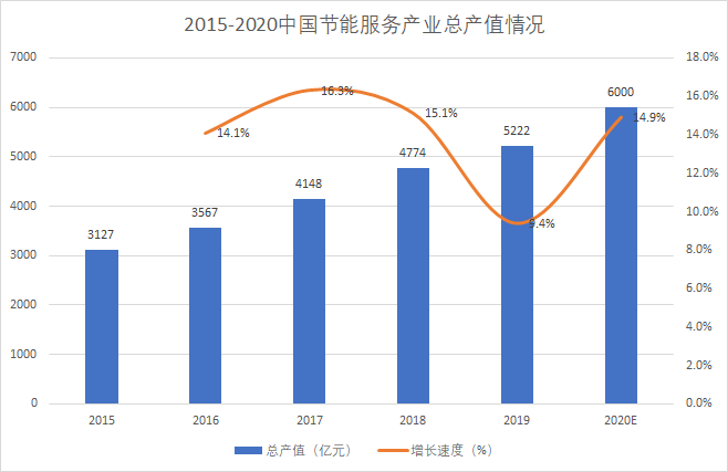 近年來,節(jié)能服務產(chǎn)業(yè)總產(chǎn)值不斷增長,呈逐年上漲趨勢。中國節(jié)能協(xié)會數(shù)據(jù)顯示,2019年我國節(jié)能服務產(chǎn)業(yè)總產(chǎn)值達5222億元,同比增長9.38%。根據(jù)《“十三五”節(jié)能環(huán)保產(chǎn)業(yè)發(fā)展規(guī)劃》,到2020年節(jié)能服務業(yè)總產(chǎn)值達到6000億元。我國節(jié)能服務行業(yè)潛力巨大。
