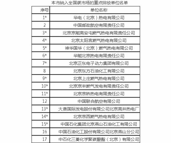 北京市納入全國碳市場的重點排放單位名單