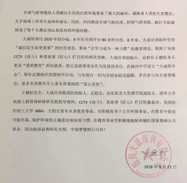 ?大成培訓(xùn)自2010年創(chuàng)辦起,至今在全國開辦80余所分校,8年來,大成培訓(xùn)始終堅持“誠信比生命更重要”的經(jīng)營理念,秉承“讓學(xué)習(xí)成為一種習(xí)慣”的教育理念,得到了央視CCTV《奮斗》和老故事《匠心》欄目組的兩次青睞。大成培訓(xùn)創(chuàng)始人、總校長王德松本人更是“愛的教育”的實踐者,將公益慈善事業(yè)作為發(fā)展的責(zé)任,在揚州中學(xué)設(shè)立“大成獎學(xué)金”,8年從不間斷。每年定期組織貧困助學(xué)行動,多次參與電臺慈善晚會,與電視臺一同為貧困家庭送溫暖,是多名貧困失學(xué)兒童未曾謀面的“愛心爸爸”。
