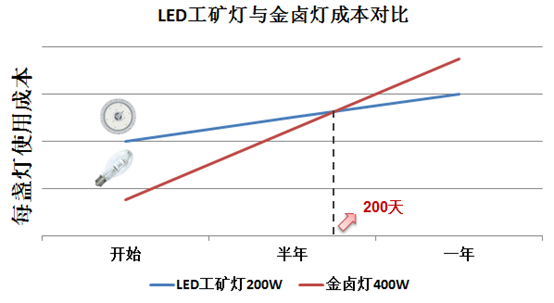 從上圖可以看出,使用價格較高的LED工況燈,最短可在200天內(nèi)收回成本。而隨著時間的推移,金鹵燈與LED工況燈的長期成本差距將實現(xiàn)跳躍性增加。